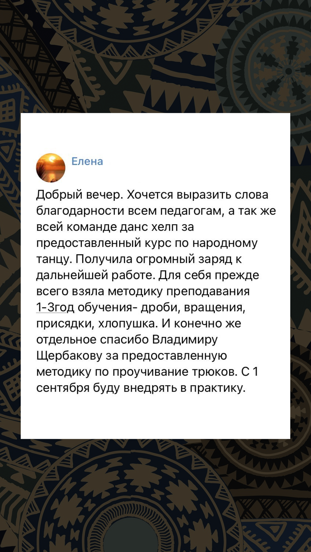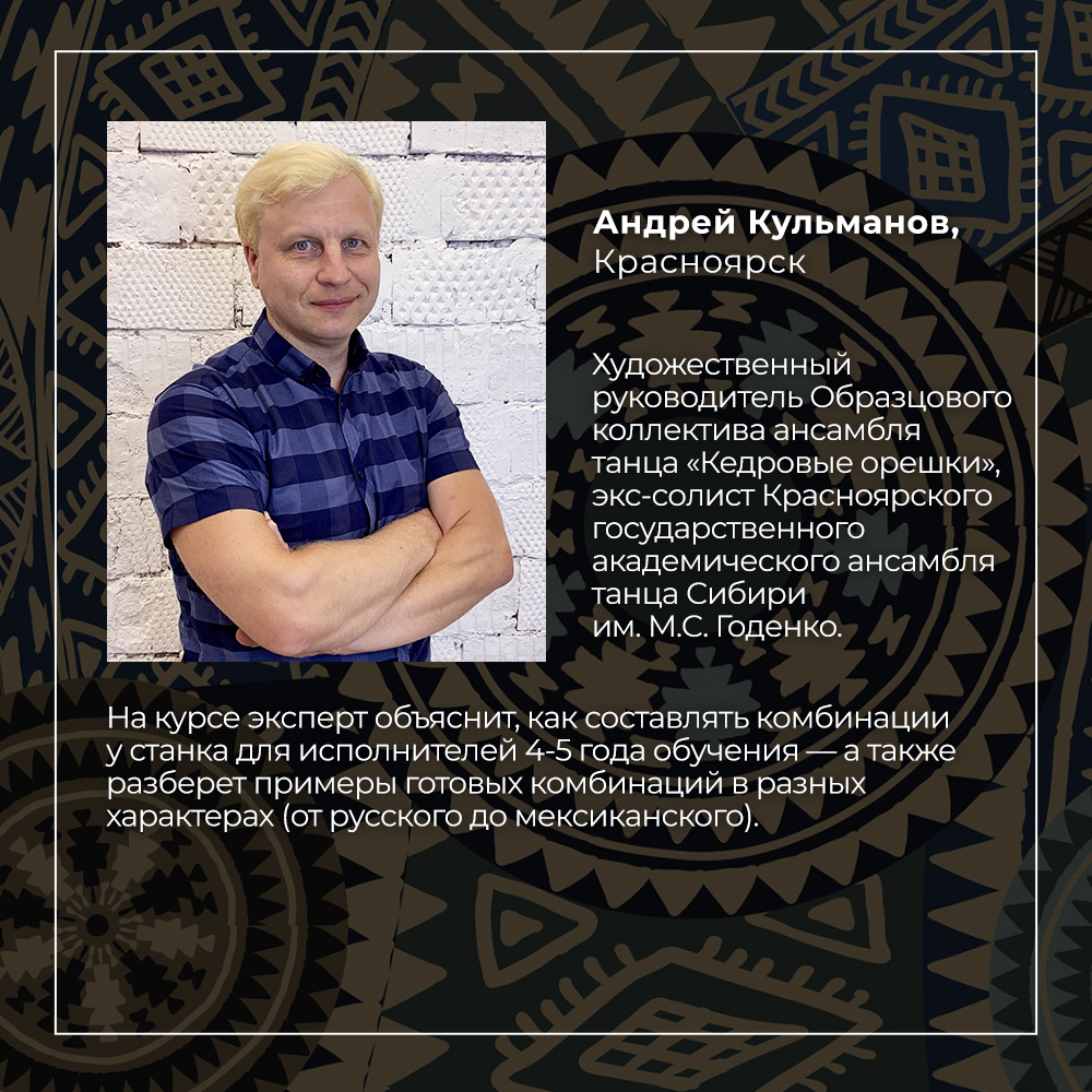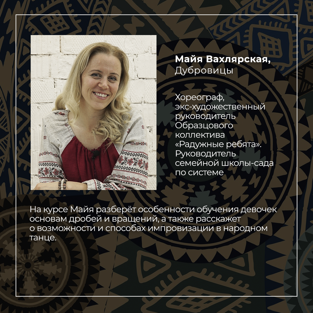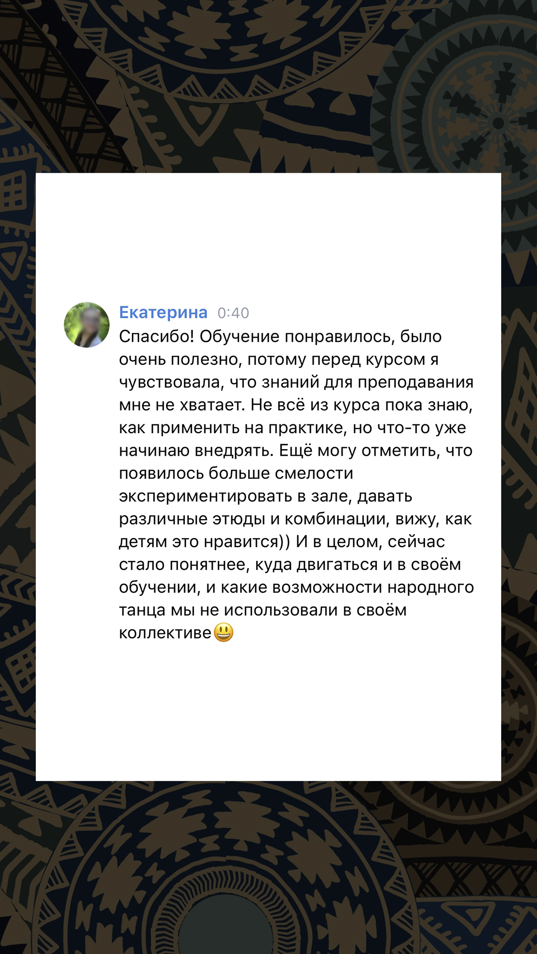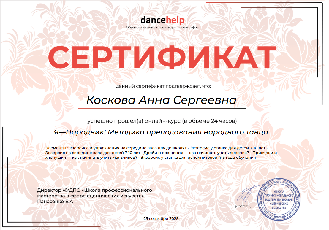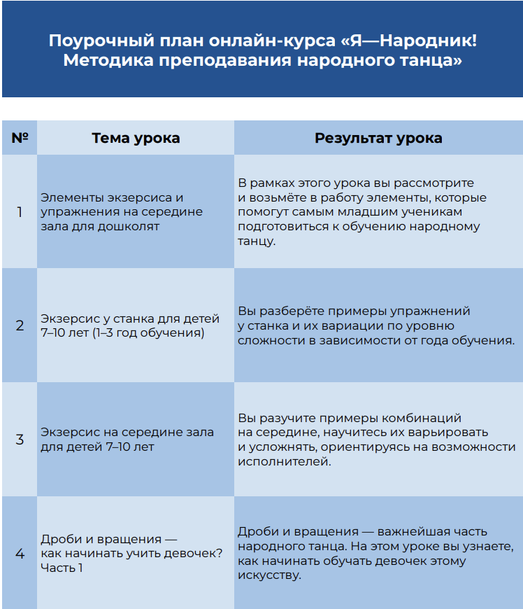 Всего за 4 недели вы получите концентрированную информацию о том, как методично и результативно преподавать народный танец ученикам разного возраста и уровня подготовки.