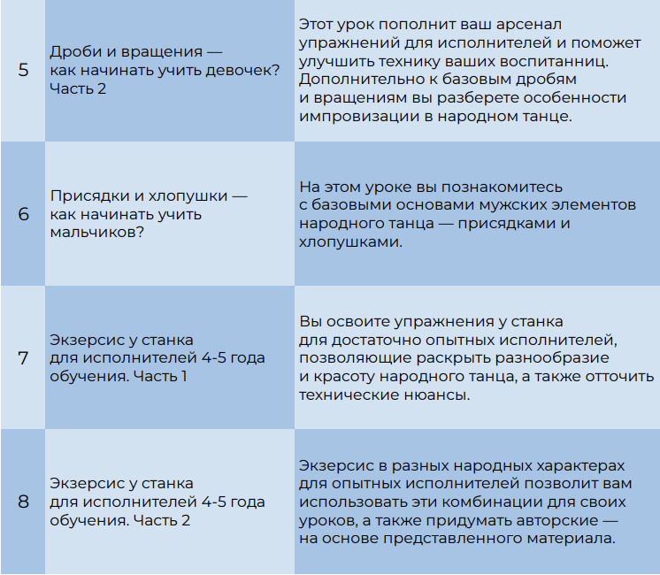 Каждый урок решает ключевую задачу, с которой сталкиваются хореографы-народники, например: введение дошкольников в народный танец, методика обучения дробям или хлопушкам, экзерсис у станка для начинающих и т.д.