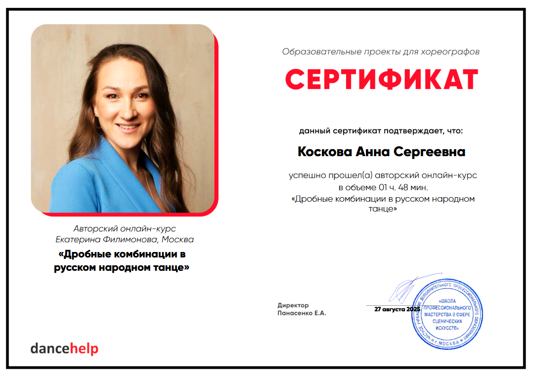 Оба урока входят в полный комплект из 6 онлайн-уроков Екатерины Филимоновой «Дроби и вращения в народном танце — от простого к сложному. Готовые комбинации и этюд на основе дробей и вращений»