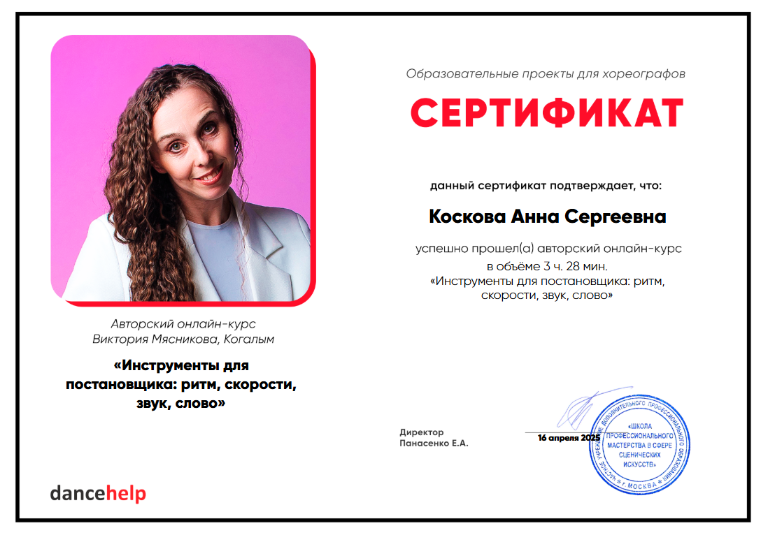 Уроки входят в полный комплект онлайн-уроков Виктории Мясниковой «Школа балетмейстера. Инструменты постановщика: ритм, скорость, звук, слово. Киноуроки и кинотанец»