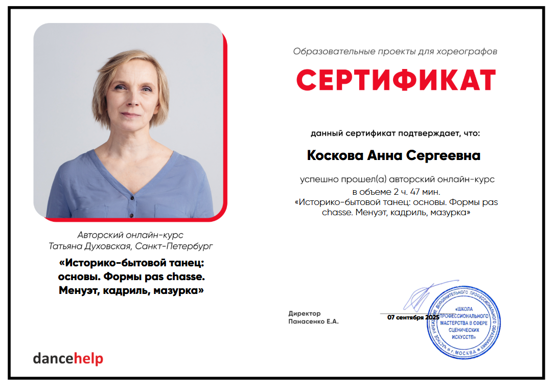 Эксперт поэтапно и последовательно знакомит с манерой и особенностями исполнения танцев «Менуэт», «Кадриль», «Мазурка», обращая внимание на:
