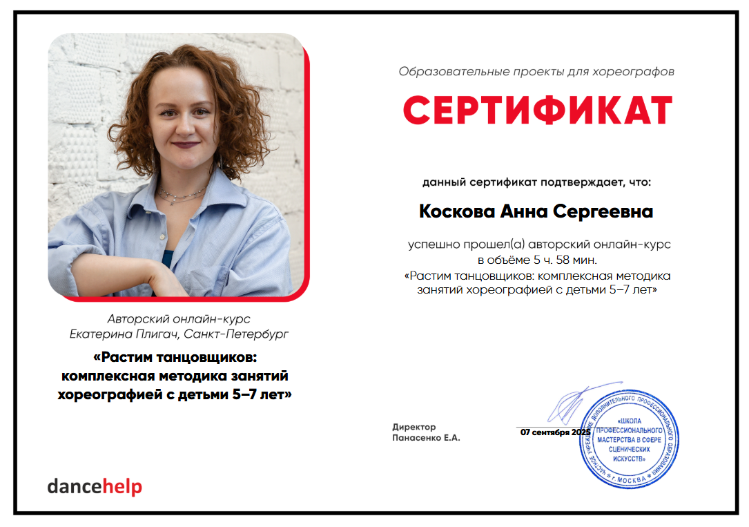 Педагог-хореограф. Руководитель студии танца «Плигунчик». Автор онлайн-лаборатории Дэнсхелп «Игровая хореография для малышей 2-6 лет», а также эксперт онлайн-курса «Я—Педагог! Дети. Педагогика, психология, мотивация».