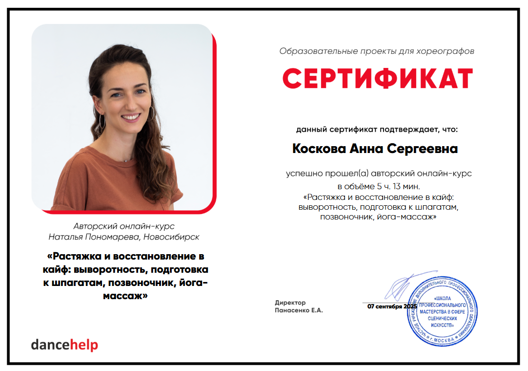 Чтобы это стало так на самом деле — изучите авторскую методику Натальи Пономаревой. Это пять онлайн-уроков, охватывающих все необходимые составляющие: подготовку к шпагату, выворотность и подвижность тазобедренных суставов, работу с позвоночником, растяжку плечевого пояса, йога-массаж.