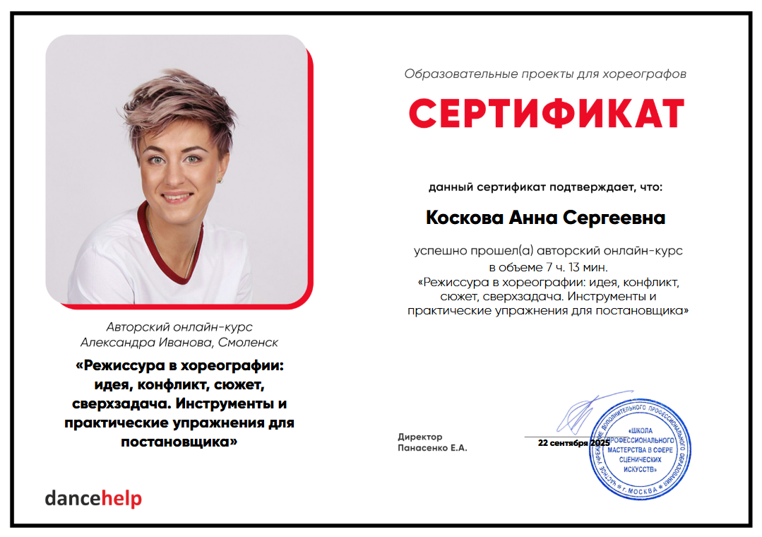 Комплект онлайн-уроков Александры Ивановой поможет вам найти ответы на эти вопросы и использовать базовые знания и приёмы режиссуры в постановке хореографических номеров и/или спектаклей.