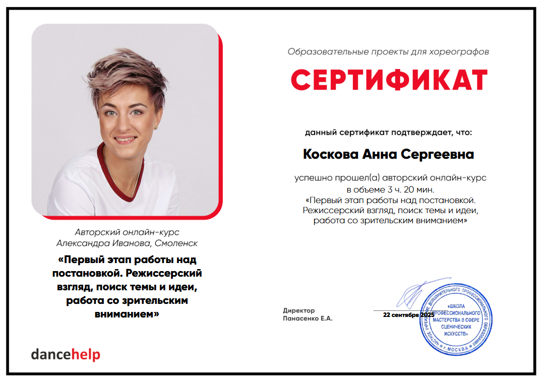 Уроки входят в полный комплект онлайн-уроков Александры Ивановой «Режиссура в хореографии: идея, конфликт, сюжет, сверхзадача. Инструменты и практические упражнения для постановщика».