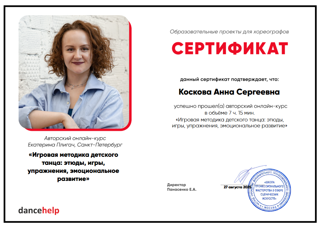 Педагог-хореограф. Руководитель студии танца «Плигунчик». Автор онлайн-лаборатории Дэнсхелп «Игровая хореография для малышей 2-6 лет», а также эксперт онлайн-курса «Я—Педагог! Дети. Педагогика, психология, мотивация».
