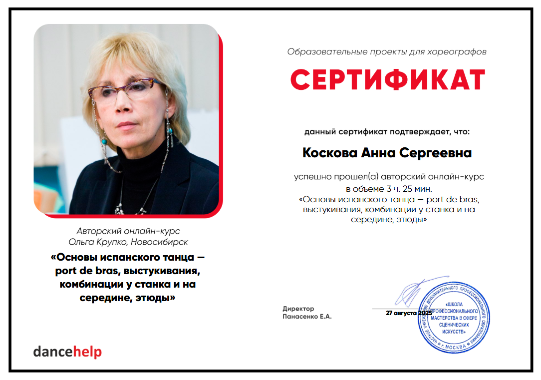 Эксперт скрупулёзно объясняет нюансы и особенности исполнения танцевальных элементов в испанском характере и их отличия от элементов классического танца. Изученный материал закрепляется в учебных и танцевальных комбинациях.