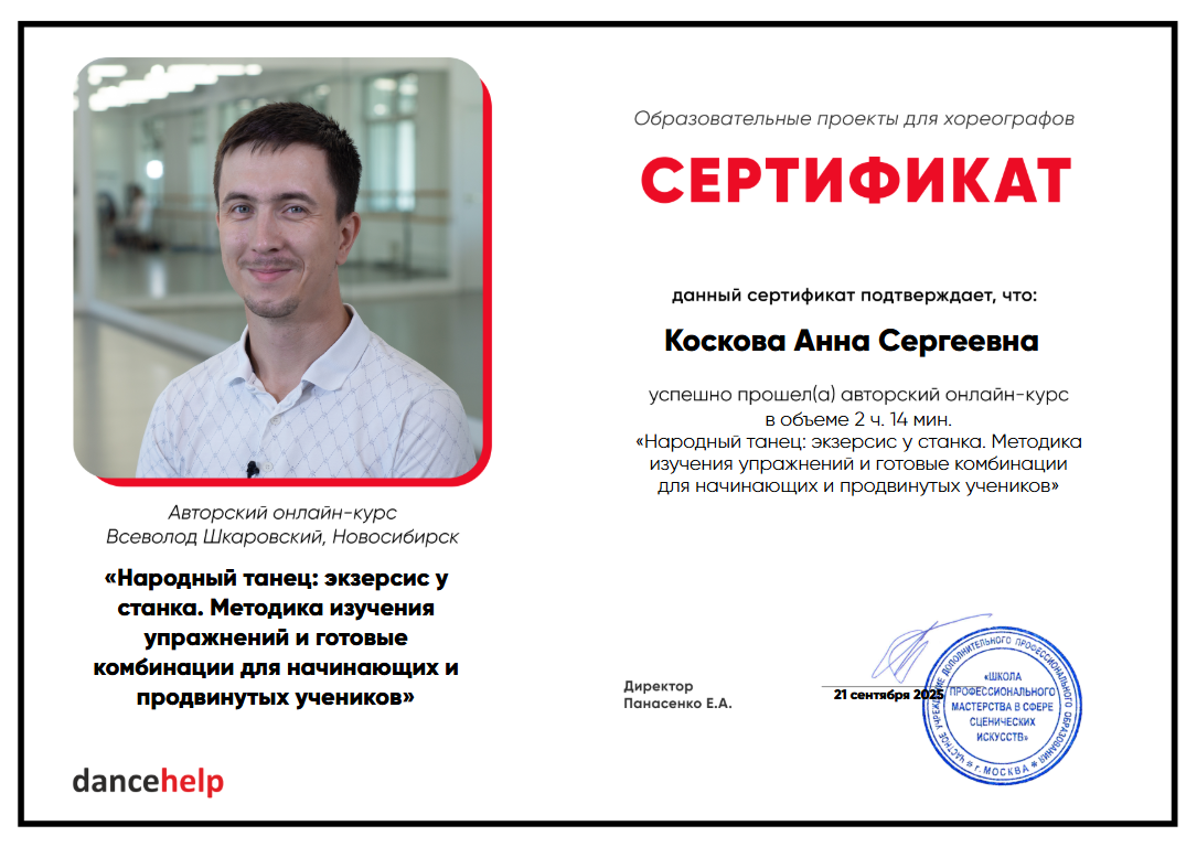 Для начального уровня обучения вы получите учебные комбинации battement developpe (несколько видов) и grand battement jete, а также танцевальные комбинации с этими элементами в русском характере.