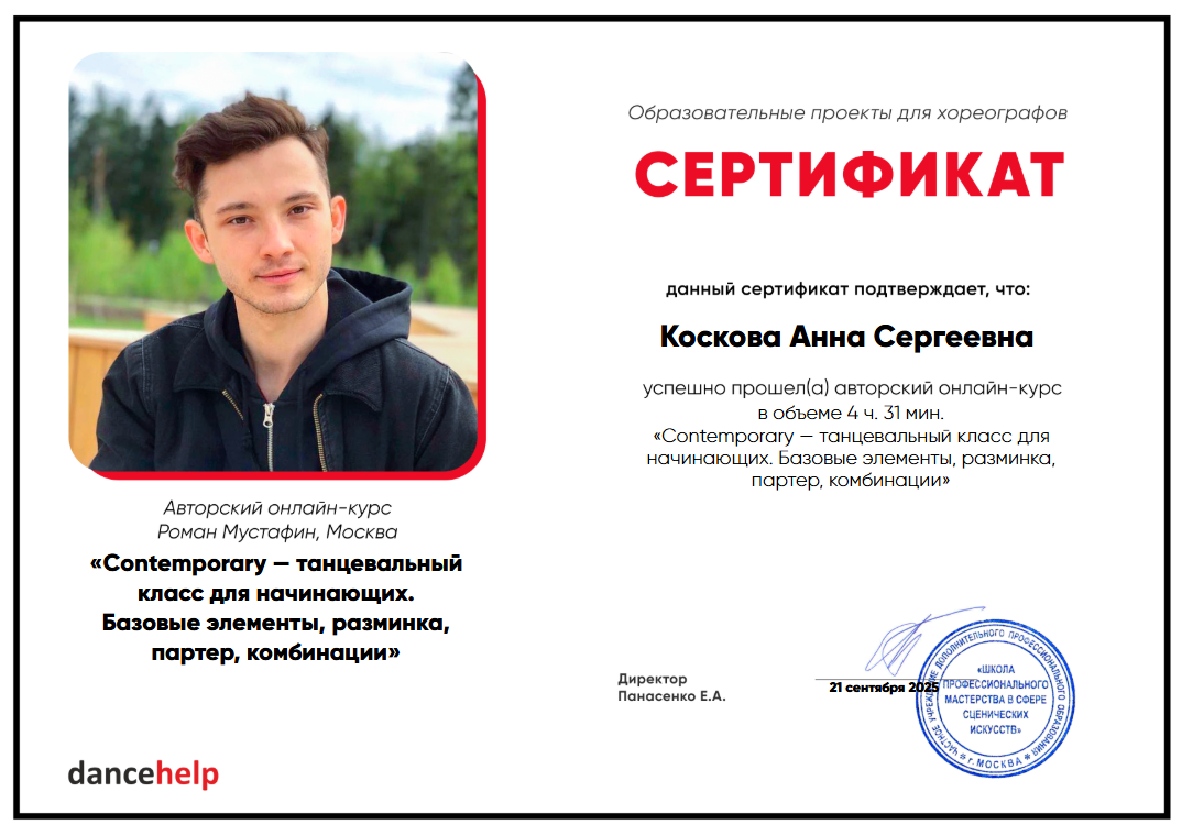 Педагог и балетмейстер современного танца. Экс-артист современной труппы театра «Балет Москва». Приглашённый хореограф и педагог в самодеятельных коллективах из разных городов России. Принимал участие в различных мастер-классах и школах педагогов и танцевальных компаний из Германии, Израиля, Бельгии, Нидерландов, Испании.