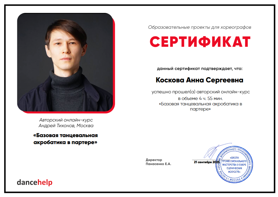 Все уроки курса входят в полный комплект из 11 онлайн-уроков А. Тихонова — Танцевальная акробатика — от основ до сложных трюков. Подготовка, методика изучения элементов, страховка