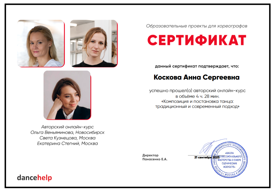 Ведущий методист Dancehelp. Экс-методист и преподаватель подготовительного отделения Новосибирского государственного хореографического училища. Педагог, постановщик, танцовщица современного танца и импровизации. Лауреат всероссийских и международных конкурсов, член жюри, организатор международного фестиваля контактной импровизации.