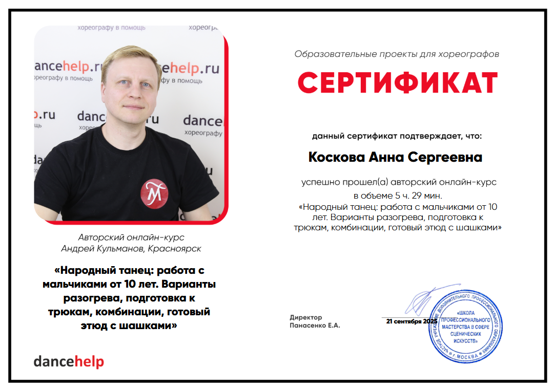 Комплект онлайн-уроков Андрея Кульманова — кладезь знаний и практического материала для работы с мужским классом в коллективе народного танца. Вы сможете его использовать для отдельных занятий с мальчиками. Если же такой возможности нет — то на общих уроках выдавать мальчикам отдельные, чисто мужские движения и комбинации.