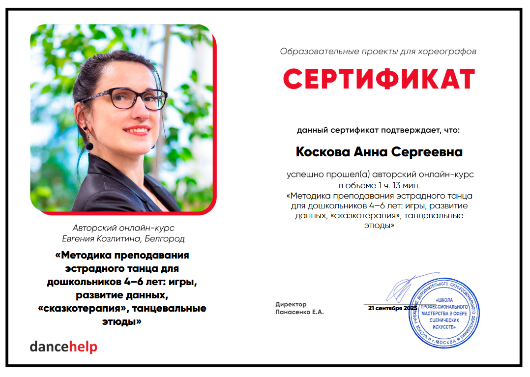Руководитель Образцового детского коллектива Ансамбля эстрадного танца «Сувенир» г. Белгород, постановщик, педагог высшей категории, почётный работник просвещения и воспитания РФ. Обладатель национальной премии «За лучшие постановочные работы» по итогам 2022 года по версии Федерации Танца России.