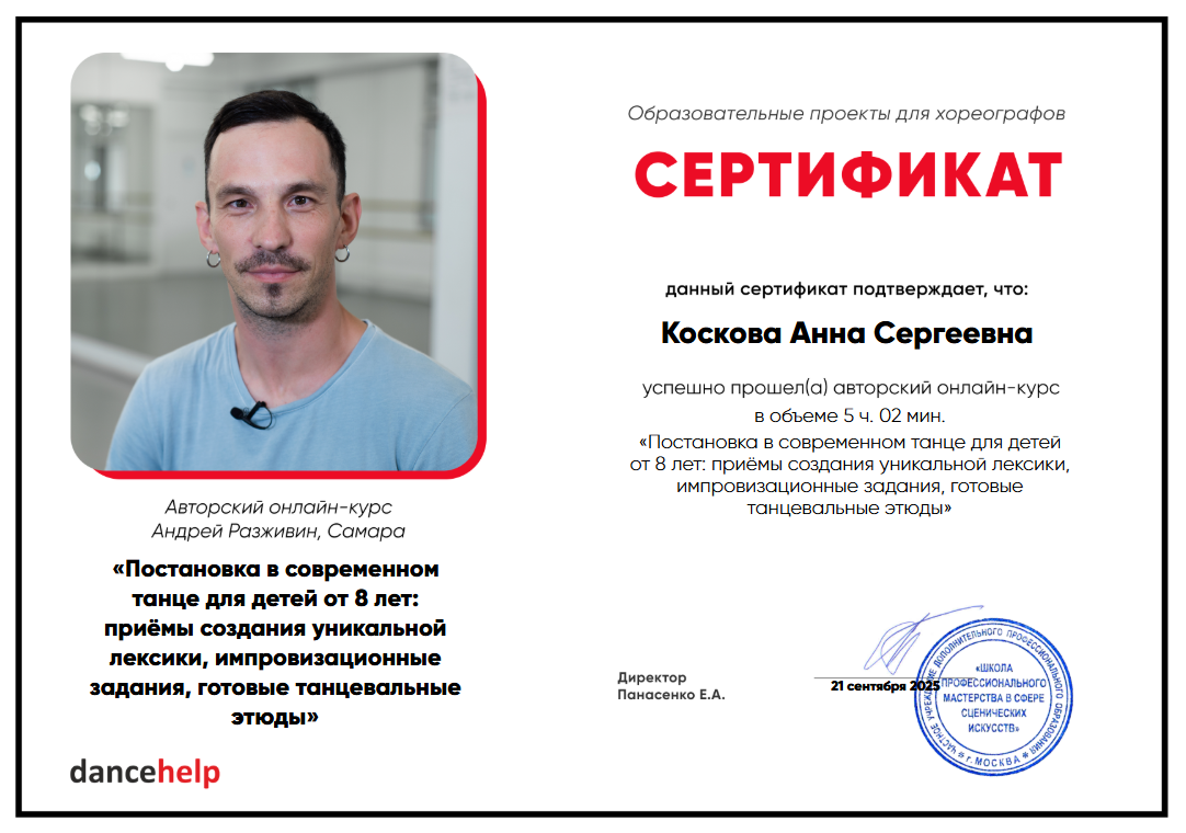 Художественный руководитель, хореограф и педагог Школы танцевального искусства «РЕКА». Поставил более 100 хореографических миниатюр и 5 хореографических спектаклей. Танцовщик, участник и педагог Всероссийских и Международных конкурсов, фестивалей и образовательных программ в области современного и детского танца.