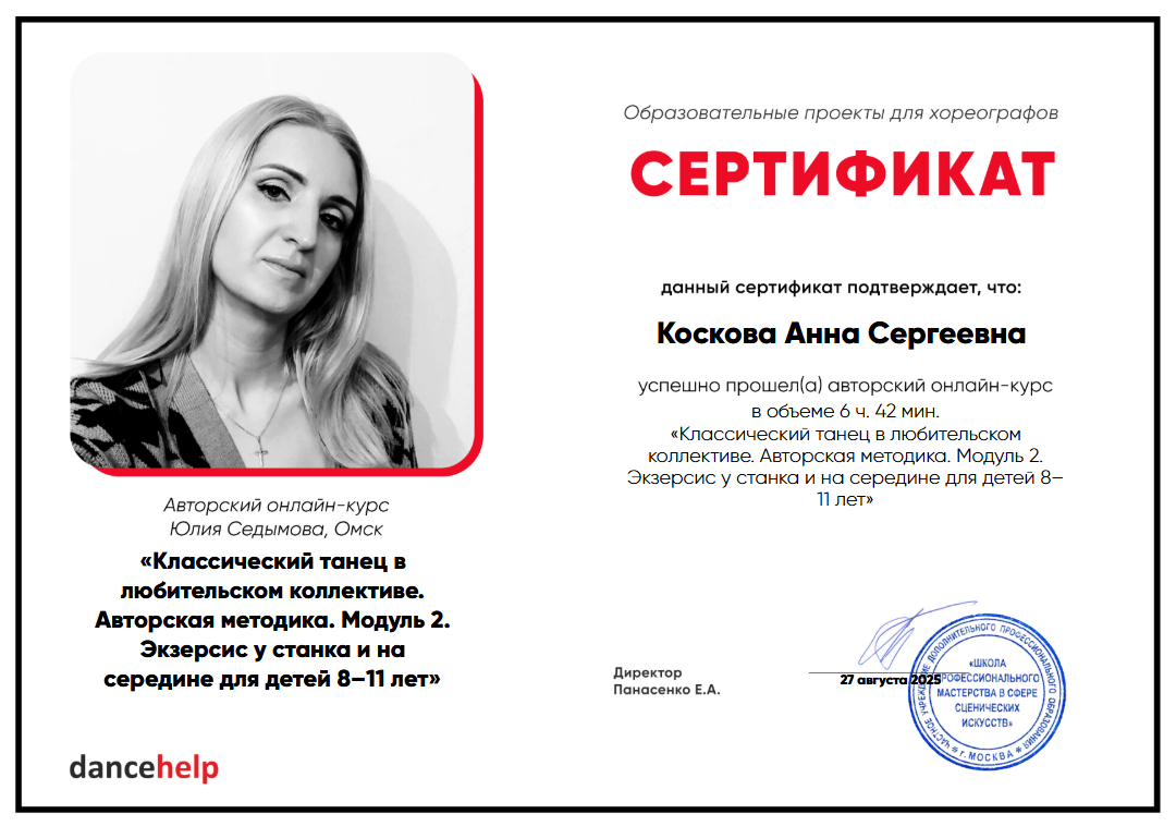 Заместитель директора, балетмейстер-репетитор «Центра современной хореографии», педагог по классическому танцу в Театре танца «нОга» (Омск), педагог уникальной методики преподавания DANAMOS
