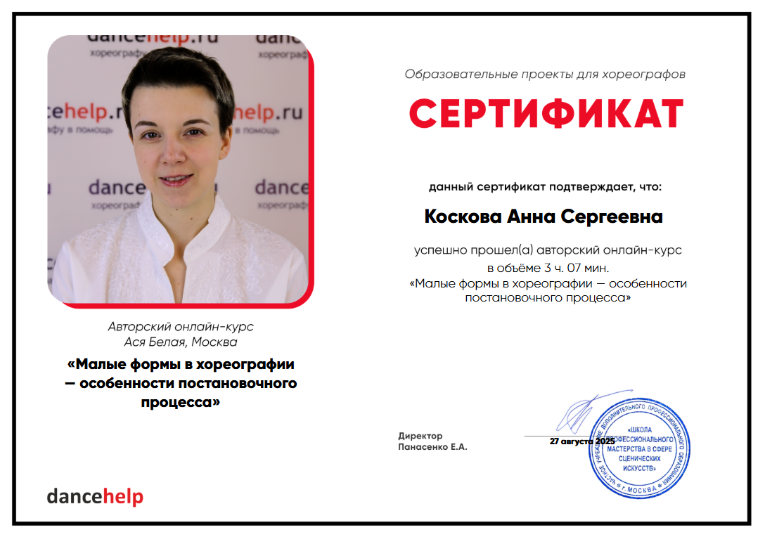Эти знания пригодятся для работы над любой постановкой — будь то малая форма, массовый номер или танцевальный спектакль.
