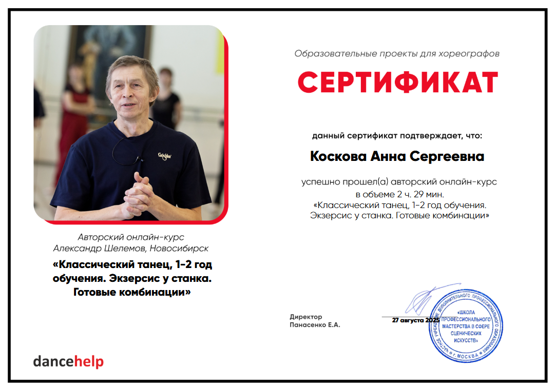 Заслуженный работник культуры РФ. Экс-художественный руководитель Новосибирского государственного хореографического училища. Преподаватель классического и дуэтно-классического танца в НГХУ.
