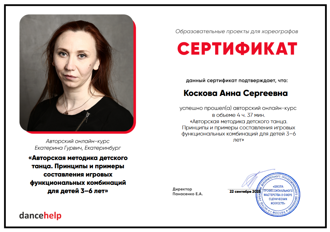 Педагог, хореограф-постановщик. Руководитель хореографического коллектива «МИКС» (г. Екатеринбург). Ведущий эксперт Дэнсхелп по направлению «Детский танец», автор онлайн-лабораторий и обучающих видео-курсов.