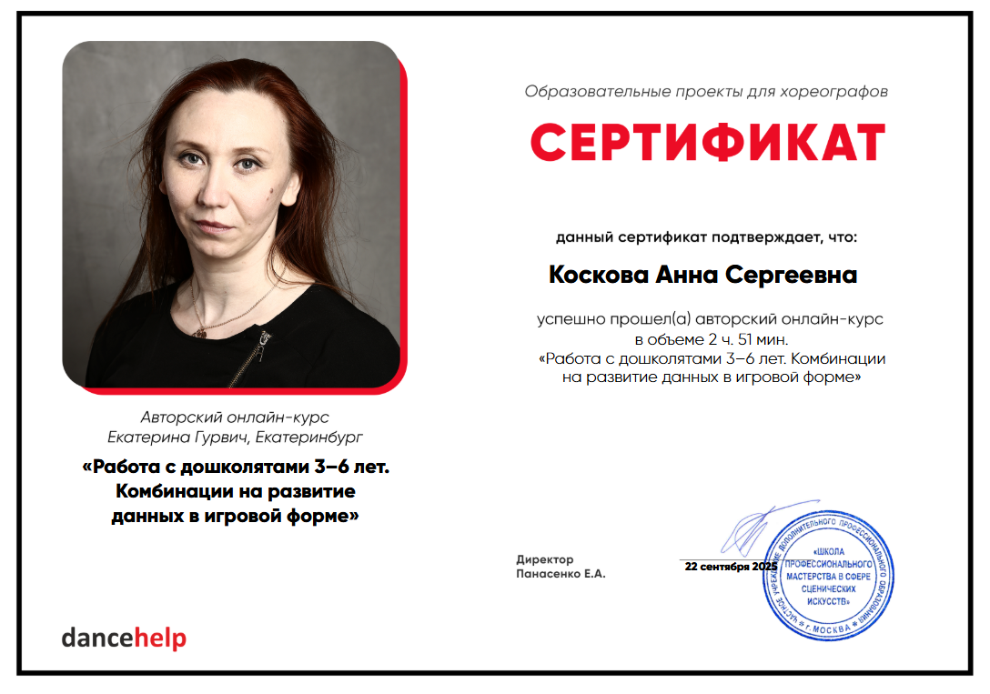 Педагог, хореограф-постановщик. Руководитель хореографического коллектива «МИКС» (г. Екатеринбург). Ведущий эксперт Дэнсхелп по направлению «Детский танец», автор онлайн-лабораторий и обучающих видео-курсов.